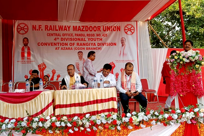 এন এফ ৰেলৱে’ মজদুৰ ইউনিয়নৰ ছয়গাঁও শাখাৰ উদ্যোগত ২৩ নৱেম্বৰত গুৱাহাটী মহানগৰীৰ আজাৰাত জাকজমকতাৰে আয়োজন কৰা হয় চতুৰ্থ সংখ্যক ডিভিনেল য়ুথ কনভেনচন (Divisional Youth Convention)। এই অধিৱেশনত ৰঙিয়া ডিভিজনৰ অন্তৰ্গত মুঠ ১০টা শাখাৰ প্ৰতিনিধি উপস্থিত থাকে। অনুষ্ঠানৰ আৰম্ভণিত ছয়গাঁও শাখাৰ সভাপতি বৰ্ণজিৎ নাথে পতাকা উত্তোলন কৰে। ইয়াৰ পিছত বন্তি প্ৰজ্বলন লগতে প্ৰাণৰ শিল্পী জুবিন গাৰ্গৰ প্ৰতিচ্ছবিত শ্ৰদ্ধাঞ্জলি জ্ঞাপন কৰা হয়। ইউনিয়নৰ সাধাৰণ সম্পাদক পিযুজ চক্ৰৱৰ্তীয়ে শ্ৰদ্ধাঞ্জলি জ্ঞাপন কৰাৰ পিছত এই কাৰ্যসূচী অধিবেশনত উপস্থিতি সকলৰ বাবে মুকলি থাকে। অনুষ্ঠানত জ্যোতি প্ৰসাদ দাসে জুবিন গাৰ্গৰ গীত পৰিবেশনৰ লগতে শিল্পীগৰাকীলৈ শ্ৰদ্ধাঞ্জলি জ্ঞাপন কৰে। উল্লেখ্য যে নীহা ভৰালীয়ে পৰিৱেশন কৰা এটি ভক্তিমূলক গীতে উদ্বোধনী অনুষ্ঠানটো অধিক প্ৰাণৱন্ত কৰি তোলে।